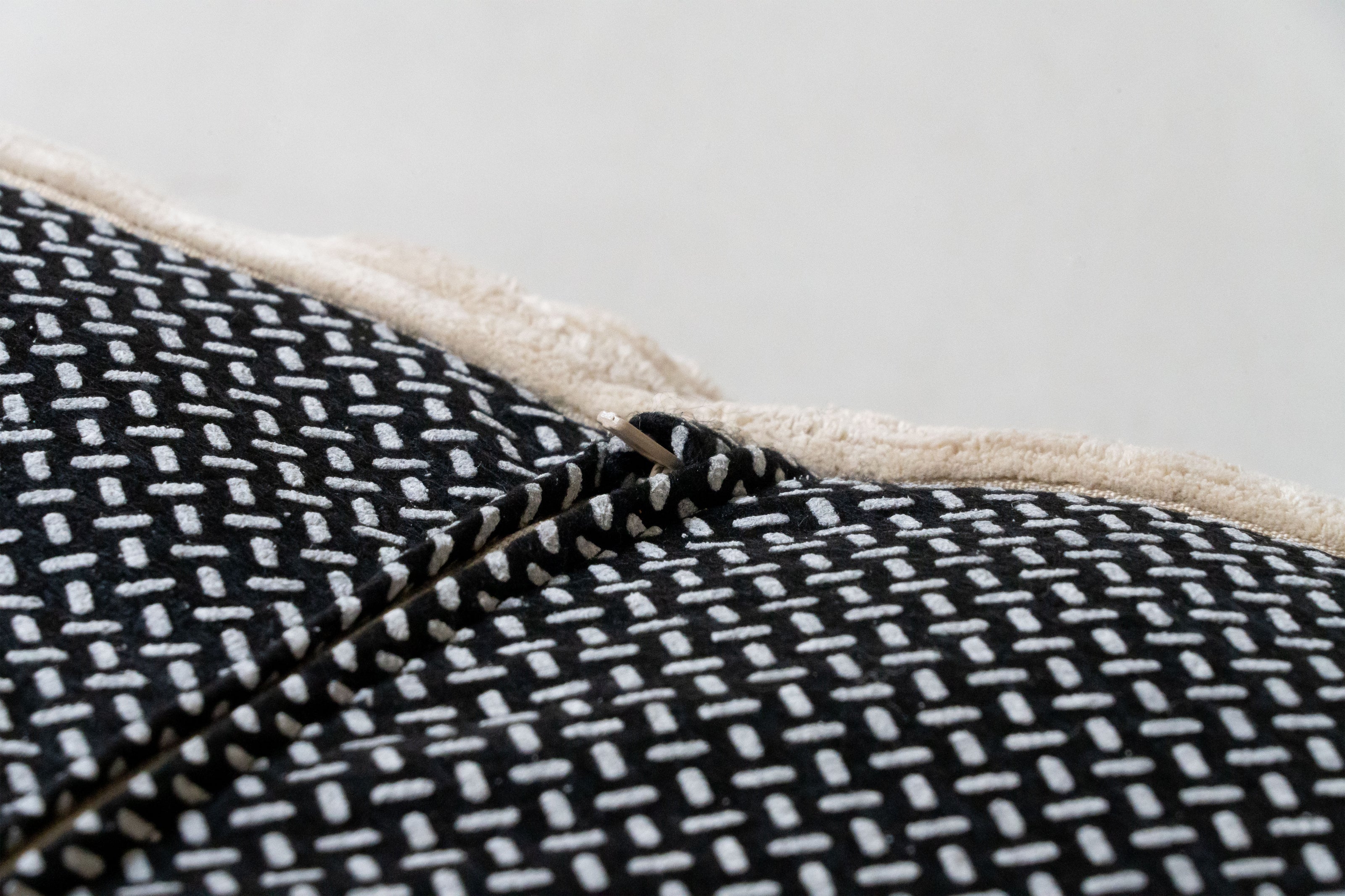 Das schwarze Gewebe mit weißen Gummistreifen sorgt für sicheren Halt – ob auf glatten Böden, Sofas oder Spielteppichen. So bleibt das Kissen, wo es hingehört – ganz ohne Verrutschen.