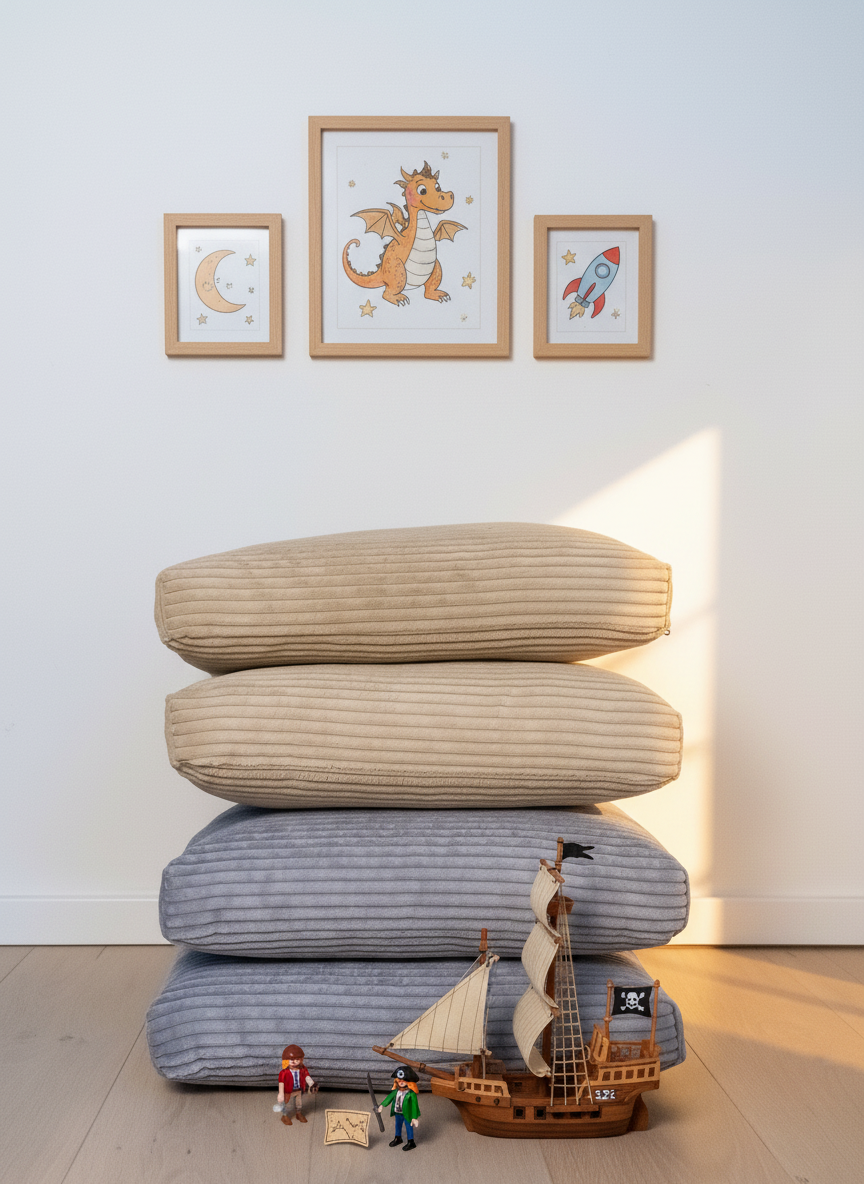 Mehrere Kammern verhindern, dass die Füllung verrutscht oder unschöne Kuhlen entstehen. So bleiben Form, Komfort und Optik über Jahre erhalten – auch bei ausgiebigem Toben. -